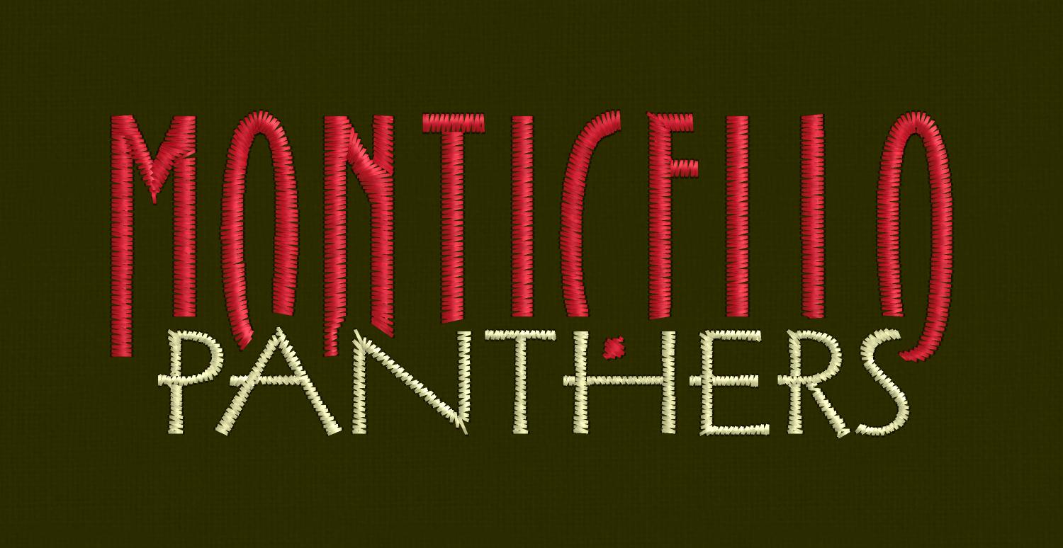 Customer: Monticello Sports Design: 404 Description: Monticello Panther Overlapping Text red & cream For Product Colors: Chocolate Options (locations): Embellishment Type: 2